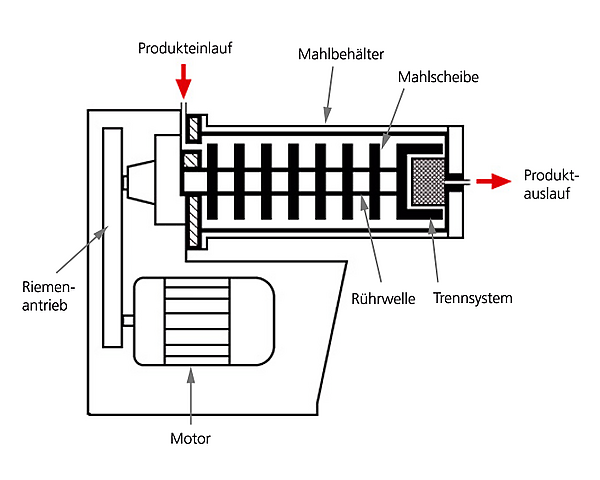 Бисерная мельница представляет собой цилиндрический сосуд с мешалкой или перемешивающим ротором, имеющим ряд вспомогательных функций и обеспечивающим различные режимы перемешивания и циркуляции бисера. Мельница заполнена бисером на 70-80 % объёма. При размоле в камеру заливают суспензию размалываемого порошка, которая заполняет весь свободный объём. При вращении ротора мельницы происходит движение бисера, который перетирает частицы материала. По окончании работы суспензию материала сливают из мельницы. Промышленная бисерная мельница работает в непрерывном или циркуляционном режимах, то есть перемалывает прокачиваемую суспензию. Все современные мельницы могут работать в таком режиме и имеют ситовый патрон или щель для отделения бисера от суспензии.