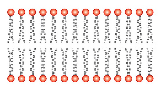 В липидном бислое молекулы ориентированы таким образом, что их полярные фрагменты обращены в сторону водной фазы и формируют две гидрофильные поверхности, а неполярные «хвосты» образуют гидрофобную область внутри бислоя (см. рис.). Бислой — термодинамически выгодная форма ассоциации полярных липидов в водной среде. Липидный бислой, состоящий из фосфолипидов (фосфатидилхолина, фосфатидилсерина и др.), является основой биологических мембран. Его толщина составляет обычно 4—5 нм. Из фосфолипидов изготавливают липосомы и наносомы для инкапсулирования и доставки биологически активных веществ, применяемых в медицине и косметологии[1].