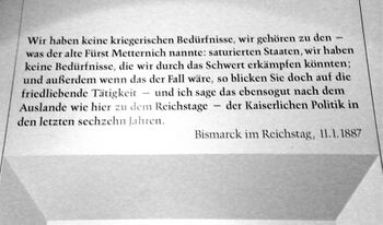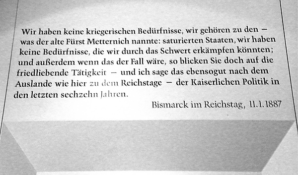 Мы не нуждаемся в войне, мы принадлежим к тому, что старый князь Меттерних имел в виду, а именно к полностью удовлетворённому своим положением государству, которое при необходимости может себя защитить. И, кроме того, даже если это станет необходимым — не забывайте о наших мирных инициативах. И я заявляю об этом не только в Рейхстаге, но особенно и всему миру, что в этом состояла политика кайзеровской Германии все прошедшие шестнадцать лет.