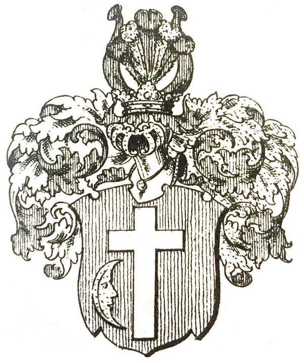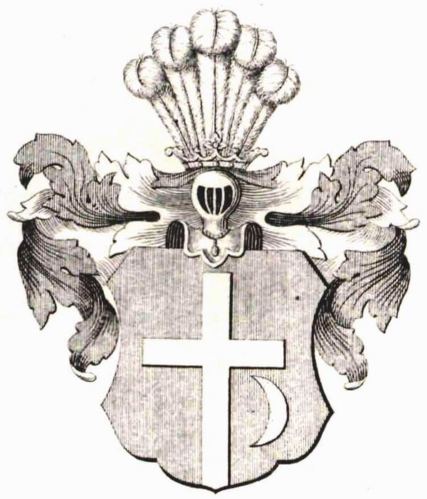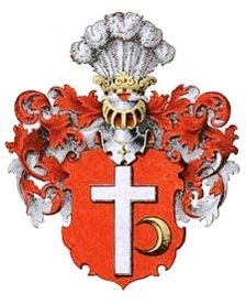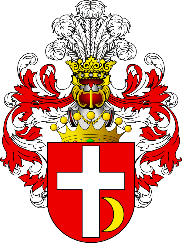 Описание герба: В червлёном поле серебряный латинский крест, в нижнем левом углу сопровождаемый обращённым рогами к правой стороне щита золотым полумесяцем. Намёт червлёный, подложенный серебром. В нашлемнике пять страусовых перьев. |