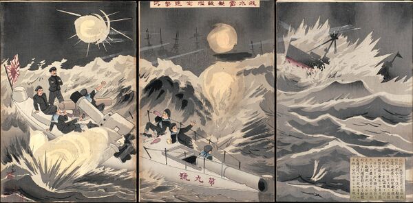 Гораздо успешнее больших японских кораблей действовали миноносцы. Хотя китайские мины были выведены из строя, восточный вход в бухту перекрывал протянувшийся на 3 км бон из стальных швартовых, которые поддерживали бревенчатые заякоренные плоты. В боновом заграждении было несколько проходов, которые, однако, охраняли китайские дозорные суда. Южный участок бона был уже разрушен японцами, но этот проход у берега был опасным из-за обилия подводных скал.