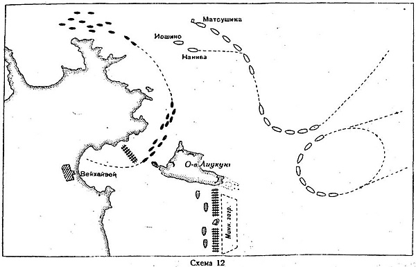 В 2 часа дня 30 января адмирал Ито с 12 крейсерами главной эскадры и «Летучего» отряда появился в виду Вэйхайвэя и проследовал в кильватерной колонне мимо острова Люгундао, обстреляв его форты с дальней дистанции. Крейсера не стали приближаться к китайскому флоту, который выстроился в бухте за боновым заграждением. Японский адмирал ссылался на опасность мин, но, на самом деле, к тому времени японцы уже обнаружили на одном из захваченных фортов пост управления минным заграждением и немедленно обезвредили его.