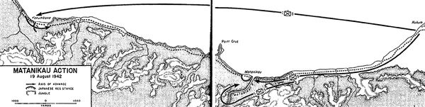 В ответ 19 августа Вандегрифт отправил три роты 5-го полка морской пехоты для атаки скопления японских войск к западу от Матаникау. Одна рота наступала по песчаной косе в устье реки Матаникау, в то время как вторая форсировала реку в 1-м километре вглубь острова и атаковала японские войска у деревни Матаникау. Третья высадилась с катеров западнее и атаковала деревню Кокумбона. После быстрого захвата двух деревень три роты морской пехоты вернулись к периметру Лунга, уничтожив 65 японских солдат и потеряв убитыми четверых своих солдат. Эта операция, иногда называемая «Первая битва при Матаникау», была первым из нескольких крупных боевых столкновений у реки Матаникау во время кампании[44].