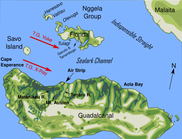 7 августа 1942 года первые подразделения союзников, в основном американские, высадились на островах Гуадалканал, Тулаги и Флорида, чтобы помешать японцам использовать их как базы для создания угрозы линиям снабжения между США, Австралией и Новой Зеландией. Союзники также намеревались использовать Гуадалканал и Тулаги в качестве плацдарма для развёртывания кампании по изоляции крупной японской базы на острове Рабаул (Новая Британия). Первоначальная высадка застала японцев, занимавших острова с мая 1942 года, врасплох. Союзникам сразу же удалось захватить острова Тулаги и Флорида, а также строившийся японцами аэродром на Гуадалканале (позднее получивший название Хендерсон-Филд).