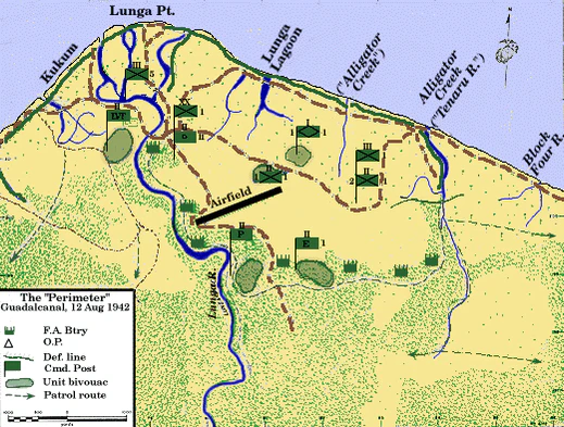 11 тысяч морских пехотинцев на Гуадалканале изначально направили основные усилия на создание оборонительного периметра вокруг мыса Лунга и аэродрома, разместив выгруженное снабжение внутри периметра обороны и завершив строительство аэродрома. За четыре дня интенсивной работы всё снабжение было перегружено с берега высадки в распределённые внутри периметра полевые склады. Работы по достройке аэродрома были начаты немедленно, главным образом с помощью захваченного у японцев оборудования и материалов. 12 августа аэродром получил название Хендерсон-Филд по имени лётчика морской пехоты, Лофтона Хендерсона, который погиб в битве у Мидуэя. 18 августа аэродром был готов к эксплуатации[39]. С транспортов был сгружен пятидневный запас продовольствия, который вместе с захваченными у японцев запасами дал морской пехоте в общей сложности 14-дневный запас провизии[40]. Для лучшего контроля за запасами солдаты были ограничены двухразовым питанием[41]. Солдаты Союзников вскоре после высадки столкнулись с массовой дизентерией, от которой к середине августа страдал каждый пятый морской пехотинец. Тропические болезни оказывали существенное влияние на боеспособность обеих сторон в течение всей кампании. Несмотря на то, что многие корейские строители были окружены морскими пехотинцами, большая часть оставшегося японского и корейского контингента собралась к западу от периметра Лунга на западном берегу реки Матаникау и питалась главным образом кокосами. Японская застава также находилась у мыса Тайву в 35 километрах (22 мили) к востоку от периметра Лунга. 8 августа японский эсминец из Рабаула доставил 113 солдат к позициям у Матаникау[42].