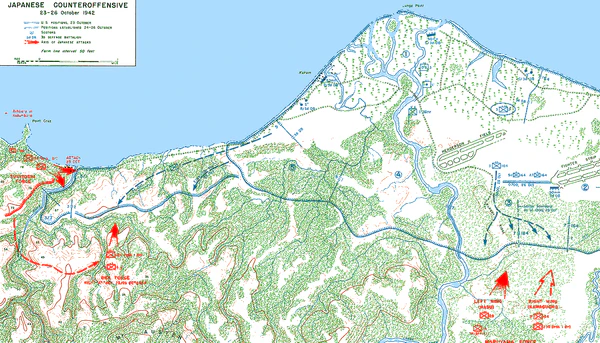23 октября войска Маруямы продвигались через джунгли к американским позициям. Вечером после получения информации, что силы правого и левого крыльев всё ещё находятся в пути к американским позициям, Хякутакэ отложил наступление на 19:00 24 октября. Американцы оставались в полном неведении о приближении сил Маруямы[97].