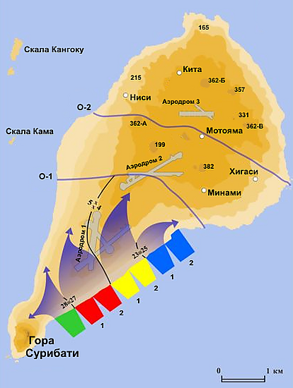 Первая линия обороны Иводзимы состояла из нескольких укреплённых позиций, которые располагались рядами и могли поддержать друг друга огнём. Эта линия простиралась от северо-западного берега до села Минами на юго-востоке. В центре линии находился аэродром Мотояма. По её периметру были построены доты, поддерживаемые танковыми частями подполковника Такэити Ниси. Вторая линия обороны начиналась немного южнее крайней северной точки Китанохана, пролегала рядом с аэродромом Мотояма и завершалась на восточном берегу острова. По сравнению с первой линией, эта была менее укреплена, но подземные сооружения и особенности рельефа давали японцам преимущества в бою. Гора Сурибати была отдельным, частично независимым оборонным районом, который имел замаскированную береговую артиллерию и множество дотов. На всех дорогах Иводзимы были вырыты противотанковые рвы. Северные отроги горы находились под прицелом японских артиллеристов как с севера, так и с юга.