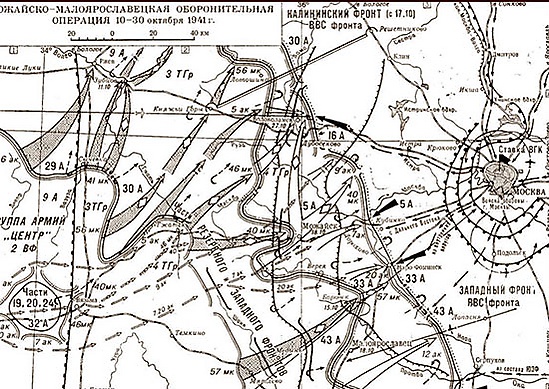 К концу сентября 1941 года сложилось положение, при котором вероятность быстрого захвата Москвы танковыми и моторизованными частями противника на Малоярославецком и Можайском направлениях была весьма высока. Немецкое командование прочно удерживало стратегическую инициативу в своих руках. Оперативная плотность группировки советских войск в целом была низкой, особенно по артиллерии: всего 12 орудий и миномётов на 1 километр фронта. Наблюдался острый дефицит боеприпасов для 76-мм и 152-мм пушек, 122-мм гаубиц, 82-мм и 120-мм миномётов. Рассчитывать на эффективность огневого поражения противника в обороне не приходилось[11].