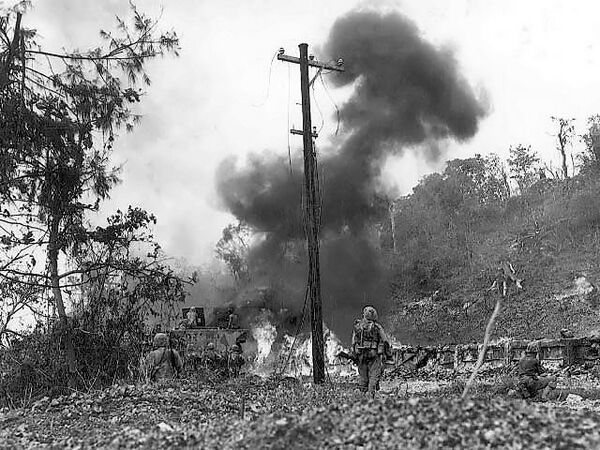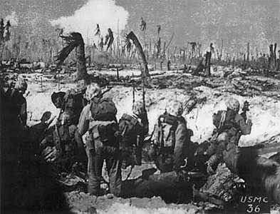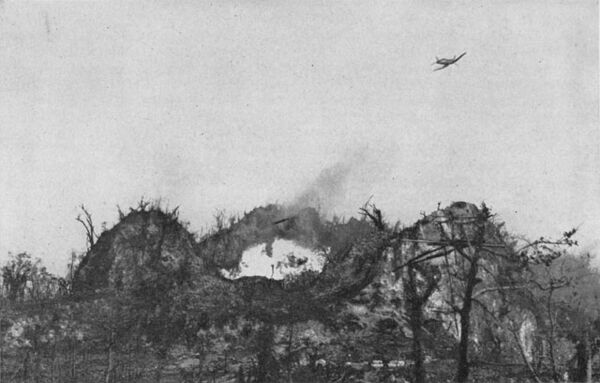 Крутые склоны этой возвышенности были утыканы странными остриями и спицами и покрыты, как сеткой, системой пещер. Противник использовал местность с дьявольской изобретательностью и создал такую сильно укрепленную позицию, какую американской морской пехоте до сих пор не приходилось брать. Среди лабиринта скал войска измеряли пройденное ими расстояние в ярдах и футах и продвигались там больше недели.