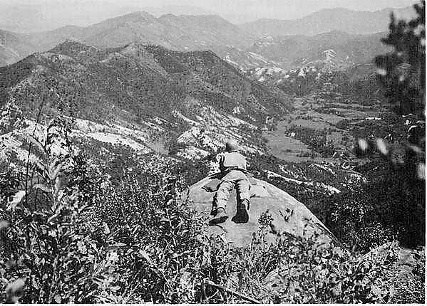 На протяжении тропы менее 1,6 км рота дважды попадала под пулемётный огонь с правого фланга, что привело к некоторым потерям. Кеннеди отказал Вэндгрифу в просьбе дать ему отделение, чтобы уничтожить вражеского пулемётчика, колонна продолжала продвигаться под огнём, пока солдаты 3-го взвода не подавили вражескую огневую точку огнём из пулемёта M1918 Browning. Выше по тропе колонна попала под обстрел другого северокорейского пулемёта, задержавшего продвижение, пока его не подавил огонь американской артиллерии[31]. Колонна сошла с тропы, заканчивающейся тупиком, в овраг слева и продолжила подъём. На этой стадии подъёма два человека были убиты и восемь ранены от миномётного огня северокорейцев. Командира 2-го взвода скосила почечная колика, и он передал командование Вэндгрифу. Тот повёл свой взвод впереди роты по промоине и в 17.00 прошёл туннелем под небольшим хребтом и каменной на шарообразную вершину высоты 755, южного отрога хребта высоты 902. Вскоре прибыли 2-й и 3-й взводы, двигаясь таким же порядком. У вершины Палмер получил по радио приказы от Гея сойти с горы. Гей не знал, что Палмер сопровождает атакующих[31].