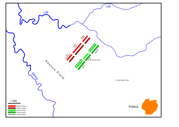 «Выбор поля боя не случаен. Холмистая область под Приштиной, ограниченная реками Лаба и Ситница, не только тактически удобна для столкновения крупных вооруженных масс. В стратегическом отношении она представляет собой ключ ко всем коммуникациям, ведущим из Подунавья к Адриатике, а также из Повардарья на север и северо-запад — к Боснии»