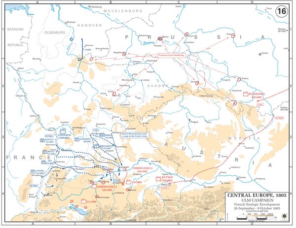 Начиная кампанию 1805 года, Наполеон сумел добиться эффекта внезапности. Как писал Е. В. Тарле, — «Наполеон шёл необычайно быстрыми переходами, совершая обход с севера расположения австрийских войск на Дунае, левым флангом которых была крепость Ульм». Описывая подготовку к кампании 1805 года, английский историк Р. Делдерфилд отмечает: «В середине осени 1805 года французская армия устремилась в долину Дуная, и генерал К. Мак узнал о её появлении лишь тогда, когда французская кавалерия извернулась в гигантскую дугу, через которую никак не могли пробиться его разведчики, а французская пехота отрезала его от всех источников снабжения и подкреплений».