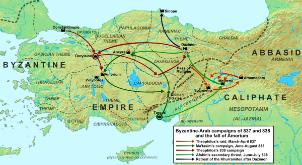 К моменту восхода на византийский престол в 829 году императора Феофила (пр. 829—842 гг.) арабо-византийские войны продолжались почти два столетия. Будучи амбициозным человеком и убеждённым иконоборцем, он решил укрепить своб власть через удачные военные действия против главного противника Византии — Аббасидского халифата. На протяжении 830-х годов Феофил организовал серию походов против южного соседа, давших умеренный успех и способствовавших имперской пропаганде в создании образа «победоносного императора».[4][5] В 837 году он лично руководил военной кампании в области верхнего Евфрата, захватив города Арсамосату и Созопетру (который некоторые источники называли место рождения халифа Аль-Мутасима) и вынудив Мелитену заплатить дань и отдать заложников в обмен на собственное спасение.[1][6][7]