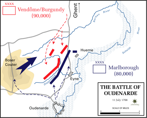 5 июля французы неожиданно двинулись на запад и заняли города Брюгге и Гент. Это сильно деморализовало Мальборо, и он не находил себе места до подхода Евгения Савойского и его армии. Тем временем французская армия вытянулась вдоль реки Шельда по всей её длине от французской границы до Гента. В руках англичан оставалась лишь крепость Ауденарде. Если бы французы взяли её, то они бы отрезали Мальборо путь к побережью и перерезали бы его сообщение с Англией. Мальборо заметил эту угрозу, и правильно предположил способ, которым французы попытаются её реализовать: они пойдут по восточному (ближайшему к Мальборо) берегу Шельды, тем временем оставив сильное прикрытие между противостоящими армиями.