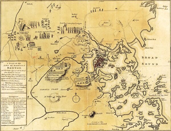 Американская армия под Бостоном сначала состояла только из ополченцев Массачусетса, но постепенно к ней стали присоединяться ополченцы других провинций Новой Англии. Командование всей армией принял генерал Артемас Уорд, а его заместителем стал коннектикутский генерал Исраэль Патнэм. Под их руководством осаждающие построили цепь укреплений, которые охватили Бостон полукольцом. Рядом с Бостоном были две доминирующих высоты, которые позволяли вести обстрел города из орудий: это были Дорчестерские высоты к юго-востоку и высоты на Чарльстонском полуострове, Бридс-Хилл и Банкер-Хилл[10]. После отступления от Конкорда британские войска отошли на Чарльстонский полуостров. Уже на следующий день (19 апреля) Гейдж обсудил положение с адмиралом Грейвзом. Тот не был способным адмиралом, но предложил разумный план: он советовал удерживать и укреплять Банкер-Хилл и Дорчестерские высоты. Но Гейдж был категорически против, он был уверен, что в Бостоне готовится восстание, и не следует разбрасывать свои немногочисленные силы. Он приказал оставить Чарльзтонский полуостров и отвести войска в Бостон. К началу мая он решил, что теперь способен подавить как восстание внутри города, так и атаку извне, хотя американцы не планировали ни того, ни другого[11].