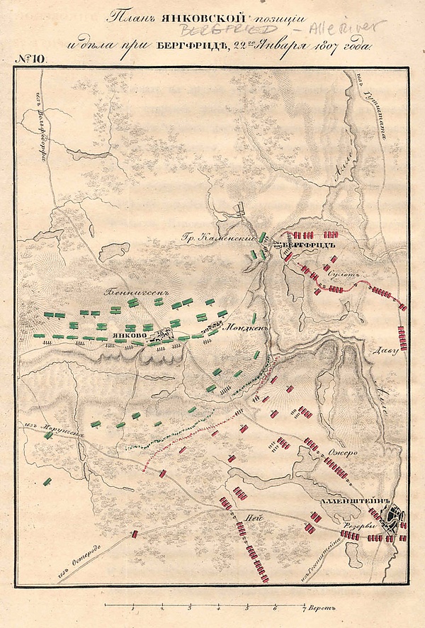 22 января (3 февраля) 1807 года при Бергфриде произошёл бой между русскими и французами, составивший частный эпизод действий армии Наполеона (около 75 тысяч солдат) против русской императорской армии графа Л. Л. Беннигсена (до 80 тысяч). Последняя, с целью отразить наступление Наполеона из-под Варшавы в восточную Пруссию, угрожавшее флангу и тылу Беннигсена, двигавшегося, в свою очередь, к нижней Висле, — заняла позицию у Янково. Левый её фланг обеспечивался отрядом графа Каменского (Архангелогородский, Углицкий и Тенгинский пехотные полки, 9 батальонов с артиллерией), который занимал переправу у Бергфриде на реке Алле (Лава), не вполне замерзшей и потому сохранявшей значение препятствия. Мост не был разрушен, а 1 батальон Углицкого полка был выдвинут на правый берег реки Алле[3].