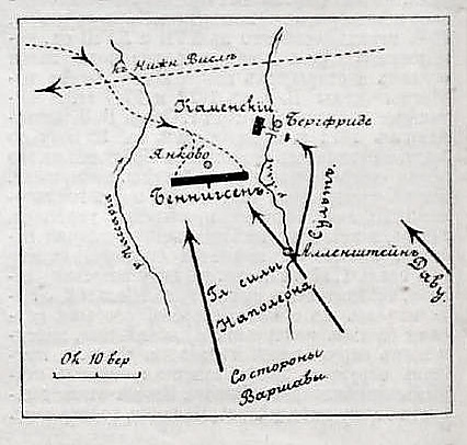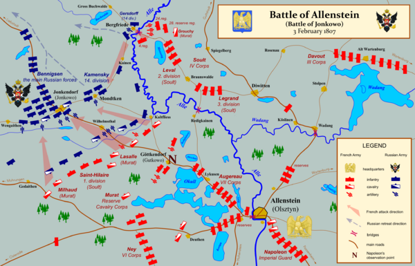 Наполеон рассчитывал, закончив сосредоточение всей своей армии в окрестностях Алленштейна 23 января, атаковать в этот день главными силами (3 корпуса) русскую армию с фронта, между реками Алле и Пассаргой (Пасленка), а двумя корпусами (Сульта и Даву) захватить в тылу левого фланга Беннигсена переправы на Алле и, таким образом, отрезать ему пути отступления на восток. Однако, полная боевая готовность русской армии 22 января заставила императора начать атаку в этот день, чтобы боем удержать противника на месте[3][4].