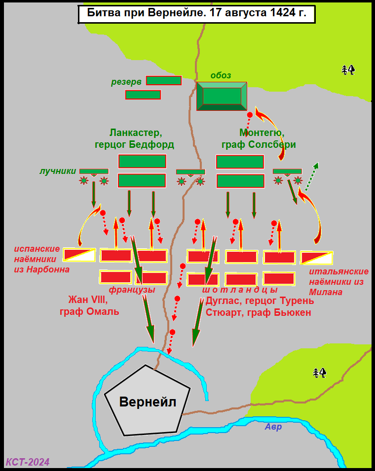 Командующие пребывали в нерешительности относительно дальнейших действий. Шотландцы и некоторые младшие командиры французской армии настаивали на немедленном сражении. В противовес им виконт Нарбоннский и представители высшего французского командования, не забывая уроков Азенкура, неохотно отзывались на решительные призывы соотечественников и союзников. В конце концов командующие пришли к компромиссу: было решено атаковать пограничные английские крепости в Нормандии, а первый удар должна была принять на себя Вернёй — крепость в западной части региона. Вскоре Вернёй был обманом захвачен французами. 15 августа Бедфорд получил тревожные новости о взятии Вернёя и незамедлительно выступил в поход. Два дня спустя Бедфорд с войсками уже приближался к городу. Решительные шотландцы, позабыв печальный опыт Халидон-Хилла, убедили своих союзников принять бой.