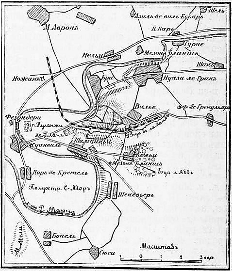 Но исход боя под Кульмье и занятие Луарской армией Орлеана совершенно изменили эти намерения. Возникло предположение, что теперь немцы ослабят линию блокады на южном фронте, почему следовало оказать содействие Луарской армии, как можно скорей, именно в этом направлении. Выполнение этого предприятия возложено было на армию генерала Дюкро (I, II и III армейские корпуса). Однако, ввиду того, что позиции немцев на южном участке блокадной линии, у Мели, Тие и Шевильи, были хорошо укреплены, было решено перейти Марну у Жуанвиля и Нельи и утвердиться сначала на плато около Вилье, отвлекая в то же время внимание противника демонстративными атаками на других фронтах. 28 ноября все приготовления к вылазке были закончены, и главные силы Дюкро сосредоточились у Венсена, а III корпус расположился у М.-Аврона[1].