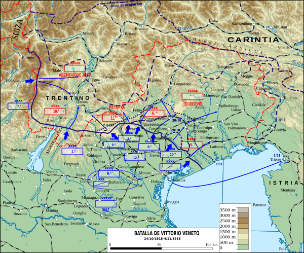 Союзники — 57 дивизий (52 итальянских, 3 британских, 2 французских, 1 американская) при 7700 орудиях и 1745 миномётах прорвали оборону австро-венгерских войск (58 дивизий неполного состава при 6300 орудиях) и ударом в центре на Витторио-Венето (8-я и 12-я армии) рассекли их фронт. Некоторые австро-венгерские части восстали и отказались повиноваться, к 28 октября уже около 30 дивизий отказались сражаться. Положение для австрийцев стало критическим. 6-я австрийская армия беспорядочно отступала, итальянские войска наступали по всему фронту, не встречая сопротивления, наступление развивалось быстрыми темпами. В результате продолжающегося наступления был занят морским десантом Триест. Союзные войска вынудили австро-венгерскую армию капитулировать. Перемирие было подписано 3 ноября в Вилла-Джусти. Боевые действия прекращались в 15 часов 4 ноября. К моменту перемирия итальянцы взяли в плен 387 000 австрийцев и более 2300 орудий. Австро-венгерская армия на итальянском фронте перестала существовать, а сама Австро-Венгрия распалась на части.