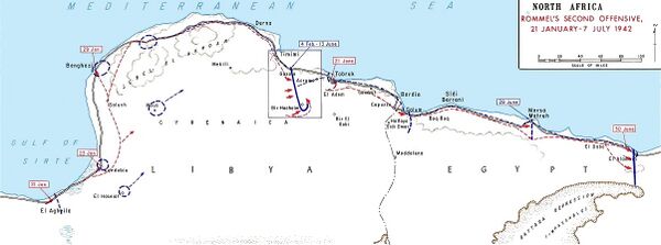 Роммель, обозначив атаку на севере, у ливийской деревни Газала (Эль-Газала) (в 48 км к западу от Тобрука), направил свои танковые войска на южный фланг британской линии обороны, чтобы зайти в тыл союзных войск. Несмотря на успехи в этом бою, Роммель оказался в сложном положении: его танки стали испытывать нехватку горючего и боеприпасов. Трудности со снабжением возникли в результате продолжающейся в южной части оборонительной линии битвы у Бир Хакейма, где силы «Свободной Франции» проявили беспримерный героизм. Ричи не спешил воспользоваться этим, и Роммель сосредоточил свои силы на ударе на западном фланге, чтобы обеспечить коридор для поставок через линию Газалы к северу от Бир Хакийма. Битва завершилась решительной победой сил Оси, однако была достигнута со слишком большими потерями танков. Лишённый эффективных танковых войск, Роммель был не в состоянии разгромить отступившую в Египет английскую армию, и его наступление было остановлено в последующем сражении под Эль-Аламейном.