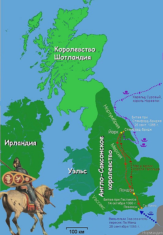 Новый король Англии Гарольд II оказался между двух огней: с одной стороны, притязания на трон выдвинул Вильгельм, с другой — в страну вторглась армия короля Норвегии Харальда Сурового, ещё одного претендента на английскую корону, которого поддержал собственный брат Гарольда Тостиг. Но с одним из соперников Гарольду справиться удалось — в битве при Стамфорд-Бридже 25 сентября англосаксонские войска Гарольда наголову разгромили норвежцев, причем король Харальд и Тостиг погибли. После этого Гарольд вернулся в Йорк, где получил известие о высадке на побережье Англии армии Вильгельма Нормандского[16].