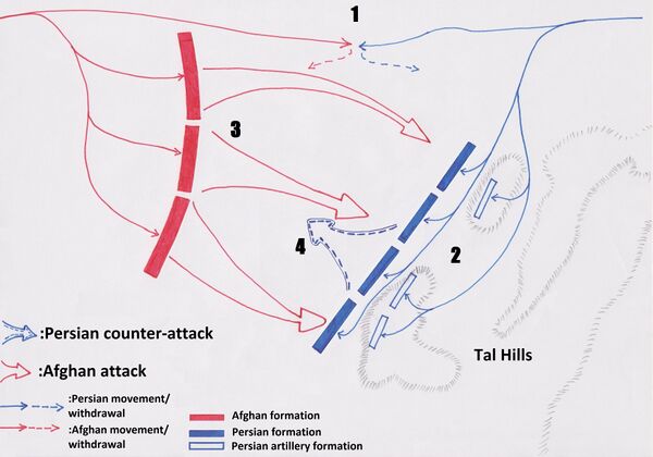 На своем правом фланге Надир выдвинул вперед арьергард, чтобы занять скалы Таль, где можно было разместить артиллерию. Афганцы узнали об этом маневре и атаковали арьергард персов[3]. Стычка не дала значимого результата: Надир велел арьергарду вернуться на исходные позиции, Ашраф также отдал приказ своим отрядам занять позиции для атаки. Пользуясь временем, занятым этим маневром, Надир расположил свою артиллерию за спинами своих стрелков для их прикрытия. По команде Ашрафа орда афганских всадников рванулась вперед с невероятной скоростью.