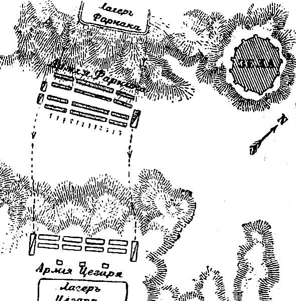 Фарнак, увидев приготовления Цезаря, утром 2 августа выстроил войска перед своим лагерем. Цезарь полагал, что это обычная демонстрация, имевшая целью отвлечь как можно больше солдат от фортификационных работ, поэтому ограничился тем, что выстроил перед своим лагерем одну боевую линию. Внезапно войско Фарнака начало спускаться в долину, а затем пошло вверх по холму на штурм лагеря Цезаря. Автор «Александрийской войны» пишет, что Цезарь считал наступление густыми порядками по крутому склону очень опрометчивым, и полагал, что ни один здравомыслящий военачальник на такое бы не решился. Он приводит несколько возможных объяснений такой рискованной тактики, среди которых, помимо удачных птицегаданий, — попытка использовать эффект неожиданности (большинство легионеров были заняты земляными работами), малочисленность римского войска, а также чрезмерная уверенность противника в своих силах. Послы Фарнака заявляли Цезарю, что их армия провела 22 сражения и все их выиграла[3].