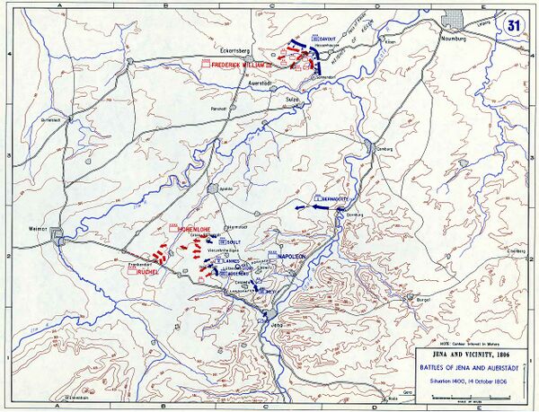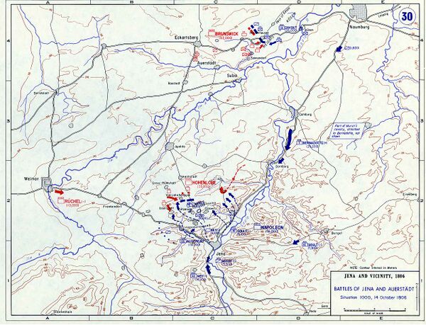 При Йене Император мог рассчитывать на ещё больший численный перевес над противником, однако маршал Бернадот, под началом которого находилось 18 500 пехоты, 1500 кавалерии и 34 орудия, несмотря на приказ, не спешил на помощь ни к Наполеону, ни к Даву, который сражался близ Ауэрштедта с втрое превосходящим его по численности противником[11].
