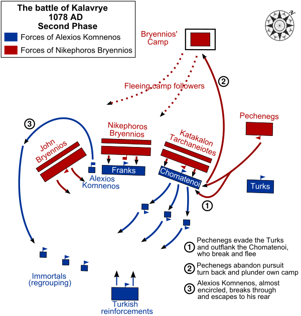 Достигнув холма перед первоначальными позициями своей армии, Комнин начал перегруппировку собственных сил. Он отправил гонцов к остаткам войска, чтобы объявить о гибели Вриенния, а его захваченная лошадь — тому свидетельство. В это время прибыло обещанное турками подкрепление, что также укрепило дух имперских воинов. В это время войска Вриенния окружили франков Алексея, которые были готовы сдаться. Но отряды мятежников смешались, а их линии были разрушены. Резервы Никифора были введены в замешательство атакой печенегов[17].