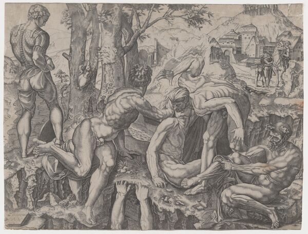 обнаженными телами, купающимися в жаркий день в реке Арно, но в это мгновение раздается в лагере боевая тревога, извещающая о вражеском нападении; и в то время как солдаты вылезают из воды, чтобы одеться, божественной рукой Микеланджело было показано, как одни вооружаются, чтобы помочь товарищам, другие застегивают свой панцирь, многие хватаются за оружие и бесчисленное множество остальных, вскочив на коней, уже вступает в бой. Среди других фигур был там один старик, надевший на голову от солнца венок из плюща; он сел, чтобы натянуть штаны, а они не лезут, так как ноги у него после купанья мокрые, и слыша шум битвы и крики и грохот барабанов, он второпях с трудом натянул одну штанину; и помимо того что видны все мышцы и жилы его фигуры, он скривил рот так, что было ясно, как он страдает и как он весь напряжен до кончиков пальцев на ногах. Там были изображены и барабанщики и люди, запутавшиеся в одежде и голыми бегущие в сражение; и можно было увидеть там самые необыкновенные положения: кто стоит, кто упал на колени или согнулся, или падает и как бы повис в воздухе в труднейшем ракурсе. Там же были многие фигуры, объединенные в группы и набросанные различными манерами: одна очерченная углем, другая нарисованная штрихами, а иная оттушеванная и высветленная белилами — так хотелось ему показать все, что он умел в этом искусстве.