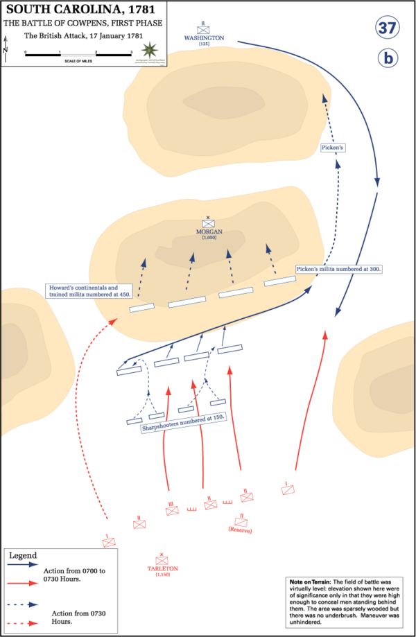 Было 07:00 когда появились первые отряды армии Тарлетона. Банастр Тарлетон слабо проявил себя в тот день. Он был выдающимся кавалеристом, но не уделял внимания тактике. Его люди были на ногах с трёх часов ночи, шли по трудным дорогам, и любой опытный офицер понимал бы, что сейчас нет необходимости немедленно атаковать. Моргану было некуда уходить, в случае отступления к реке он был бы легко разбит. У Тарлетона была артиллерия, а у Моргана её не было. Тарлетон вполне мог бы обойти позицию противника и атаковать его с фланга, и кавалерия Уильяма Вашингтона едва ли смогла бы ему помешать. Но Тарлетон решил не откладывать атаку, а сразу же атаковать противника во фронт. Он отправил небольшой отряд драгун прощупать передовую позицию Моргана, но драгуны попали под огонь стрелковой цепи, потеряли 15 человек и отступили. Тогда Тарлетон построил свой отряд в одну линию примерно в 400 метрах от передовой позиции американцев и, как раз на восходе, приказал атаковать[14].