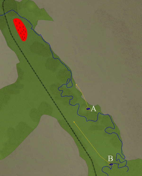 Кастер, двигаясь на север, взобрался на вершину Рино-Хилл, когда отряд Рино уже спешивался для атаки. Увидев истинный размер стойбища индейцев, он послал курьера к Макдугалу с указанием скорее доставить боеприпасы. Отряд продолжил движение вдоль реки, добравшись до холма напротив стойбища (позже известного как Колхаун-Хилл), где Кастер решил перейти брод. Однако через реку успел перебраться десяток индейцев, открывших ружейный огонь. Кастер, возможно опасаясь многочисленной засады, приказал отступить. Он отправил горниста (они исполняли в армии функции посыльных) Мартина на юг, чтобы тот разыскал и привёл роты Бентина. Мартин оказался последним американцем, кто видел живыми солдат колонны Кастера.