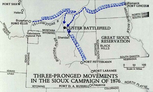 В июне колонна генерала Терри, наступая вдоль южного берега Йеллоустоуна, наткнулась на недавно покинутые пастбища. Собрав совет, Терри решил наступать на юг, куда ушли индейцы, пехотой и артиллерией, в то же время послав кавалерию к верховьям реки Литл-Бигхорн, чтобы та заперла путь для отступления сиу. 22 июня все 12 рот 7-го кавалерийского полка, отряд индейцев-разведчиков и 175 мулов с запасом продовольствия на 15 дней под руководством Кастера выступили. 24 июня Кастер обнаружил следы огромного лагеря и решил совершить ночной марш-бросок, чтобы не дать индейцам скрыться. Полк прибыл на место в 2 ночи 25 июня, после чего разбил лагерь.