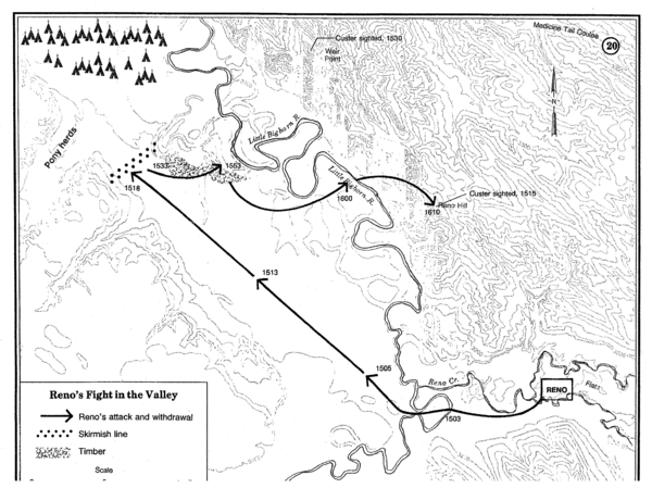 Бешеный Конь повёл индейцев в атаку, они также зашли с флангов в тыл к американцам. Рино решил прорваться на холм на противоположной стороне реки (сегодня называющийся Рино-Хилл), при отступлении его роты понесли значительные потери: 46 человек погибло, ещё около двух десятков не смогли прорваться на холм, спрятавшись в зарослях. Роты заняли оборону на холме, а основная масса индейцев отправилась на север, откуда также раздавались звуки битвы. С начала боя прошло около сорока пяти минут.