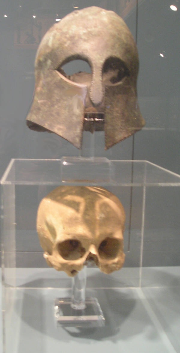 В состав защитного снаряжения также входили бронзовые поножи. Они повторяли рельеф передней части голени, чтобы плотно облегать ноги и не мешать ходьбе[49].