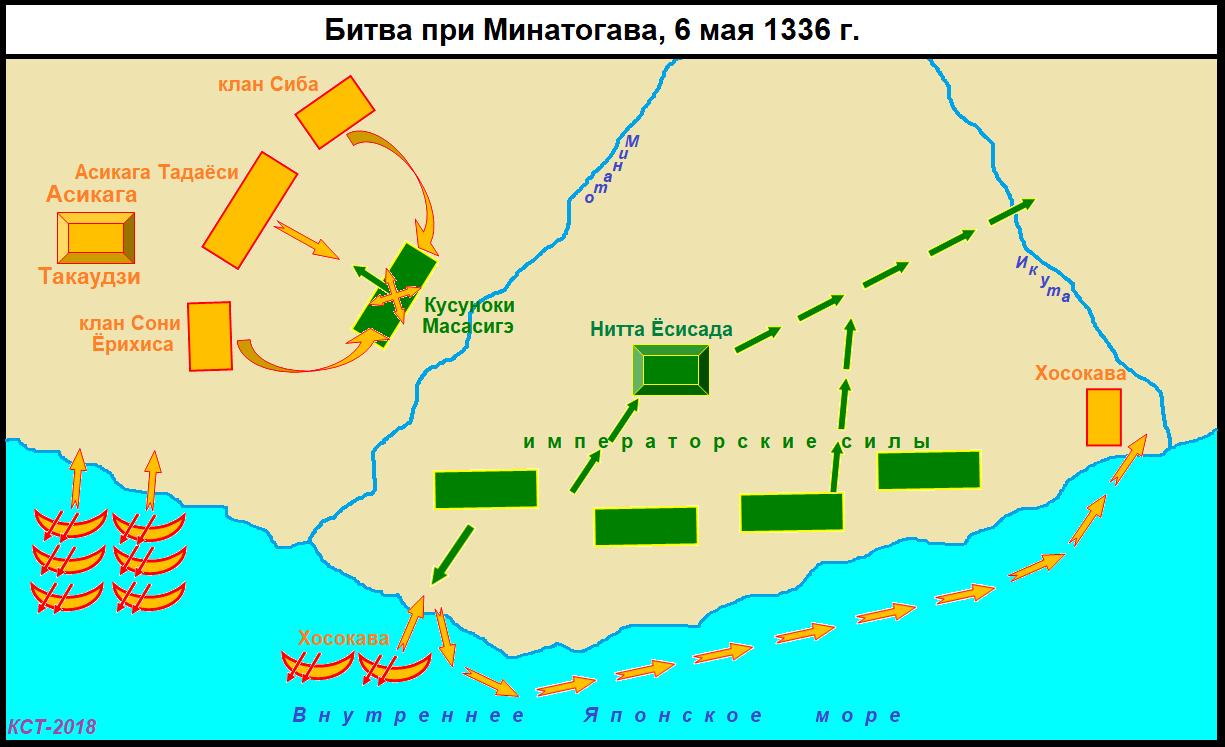 Под натиском сильного противника армия Нитта Ёсисада начала отход. Император Го-Дайго, обеспокоенный продвижением противника, дал распоряжение о генеральном сражении. Как сообщают источники, Кусуноки Масасигэ предлагал другой план: продолжить тактическое отступление, заманив противника в Киото, из которого Асикага Такаудзи уже был выбит однажды войсками Нитта Ёсисада. Однако этот план не был принят императором. Кусуноки Масасигэ возражать не рискнул, однако считал, что императорская армия обречена на поражение.