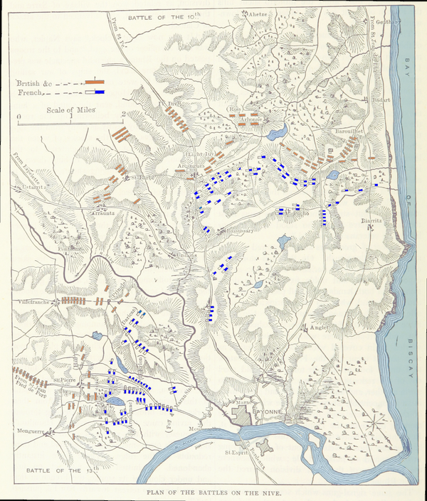Эти реки вместе с Бискайским заливом образуют возле Байонна некое подобие греческой буквы «пи» (π). Левая вертикальная палочка — берег моря, правая — Нив, а перекладина — Адур. Байонна находится там, где Нив соединяется с Адуром. Первоначально армия Веллингтона была ограничена территорией между Бискайским заливом и Нив. Чтобы освободить место для манёвра, британскому генералу пришлось расположить свою армию на восточном берегу Нива. Проблема Веллингтона заключалась в том, что, разделив два крыла своей армии, он предоставлял противнику возможность разбить их поодиночке. Сульт, являвшийся опытным стратегом, понял это и попытался воспользоваться ситуацией. Перемещая свою армию через укреплённый город Байонна, Сульт мог легко перебросить её с одного берега Нивы на другой.