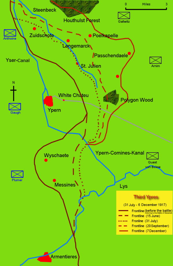 В ходе наступления британские войска множество раз предпринимали попытки прорвать германский фронт в районе Пашендейля. Однако им так и не удалось добиться прорыва германского фронта в намеченных местах. Сражение продолжалось с июля 1917 года и завершилось 6 ноября 1917 года, когда канадским войскам удалось захватить деревню Пашендейль.