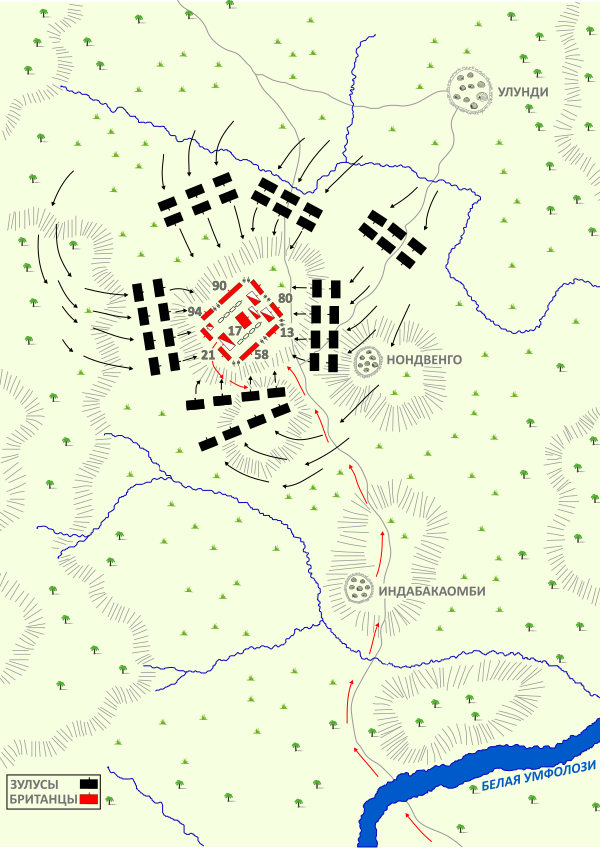 Именно такой боевой порядок принёс зулусскому королевству успех в сражениях с окружавшими народами и позволил одержать победу при Изандлване[29]. Кроме того, зулусы могли применять тактику засад, скрывая в высокой траве целые отряды, которые в нужный момент вставали бы в полный рост и открывали огонь из винтовок или бросались в рукопашную — как раз благодаря такому методу они в стычке 3 июля отбросили английский конный разведывательный отряд.