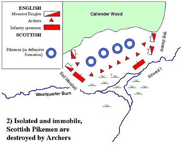 Воины шилтронов сомкнули ряды. Завязалось кровопролитное сражение. В критический момент шотландская дворянская конница предала Уоллеса и покинула поле боя. Пешие стрелки и копьеносцы остались без прикрытия кавалерии. Шотландские лучники, оставшиеся стоять на месте, были быстро уничтожены, однако воины шилтронов прочно держали оборону. Рыцари, недооценившие оборонительные возможности шотландского боевого порядка, во множестве гибли на шотландских кольях и копьях. Король прибыл на место боя уже тогда, когда конница, понёсшая значительные потери, была уже в полном расстройстве. Однако королю удалось быстро восстановить дисциплину и организовать отступление кавалерии. Вслед за этим он решил использовать тактику, которая была успешно применена англичанами в сражениях с валлийскими копьеносцами.