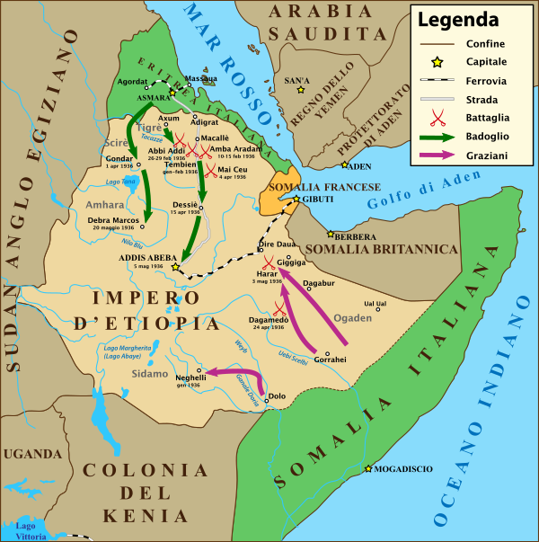 3 октября 1935 генерал Эмилио Де Боно вторгся в Эфиопию из Эритреи без объявления войны. Де Боно имел в составе своего войска около 100,000 итальянских и 25 000 эритрейских солдат для вторжения в Аддис-Абебу. В декабре, после короткого периода бездействия и незначительных неудач итальянцев, Де Боно был заменён Бадольо.