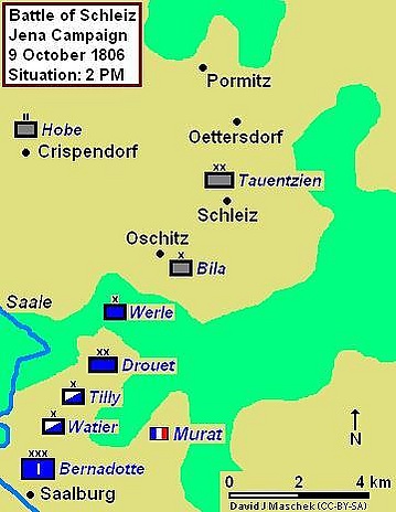 Около 9000 саксов располагались у Аумы в 15 км к северо-северо-востоку от Шлайца, а прусский отряд оберста Карла Андреаса фон Богуславского находился в 18 км к северо-северо-западу от Нойштадт-на-Орле. Отряд генерал-майора Кристиана Людвига Шиммельпфеннига из 600 кавалеристов находился в 20 км к северо-западу у Пёснека. Дивизия Тауэнцина насчитывала 6000 пруссаков и 3000 саксов. Три пехотные дивизии Бернадота возглавляли дивизионные генералы Друэ, Пьер Дюпон де л’Этан и Оливье Маку Риво де Ля Раффиньер, а его корпусную кавалерийскую бригаду возглавлял бригадный генерал Жак Луи Франсуа Делетр де Тийи. Генерал дивизии Жан Батист Эбле командовал артиллерийским резервом корпуса.