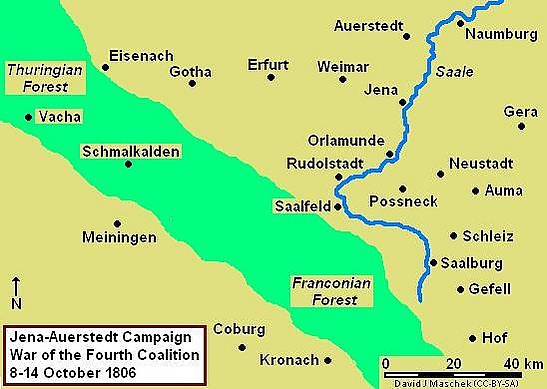 Тюрингенские и франконские леса тянутся к северо-западу от Богемии. Этот район состоит из лесистых гор высотой около 750 метров. В 1806 году через урочище было всего несколько плохих дорог. Наполеон выбрал маршрут своего вторжения в зону, где полоса пересеченной местности была самой узкой, во Франконском лесу на востоке[15]. Французская армия пересекла саксонскую границу 8 октября, прикрытая впереди легкой кавалерией. Наполеон не был уверен, где находится противостоящая прусско-саксонская армия, поэтому его армия была организована в battalion carré (батальонную площадь), способная концентрироваться против угроз, исходящих с любого направления[16].