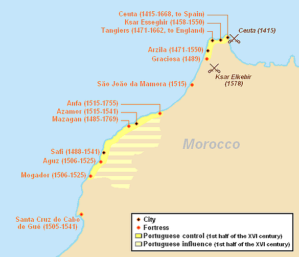 Марокко, напротив, испытало стремительный взлёт. К власти пришёл брат Абд аль-Малика Ахмад аль-Мансур, проявивший себя чрезвычайно способным правителем и добившийся территориального (была завоёвана империя Сонгай с богатыми городами Тимбукту и Гао), экономического и политического подъёма страны. Союза с марокканским правителем начали искать европейские монархи; его богатства (значительную часть которых составил выкуп за португальских пленников) стали легендарными и принесли ему прозвание аз-Захаби («золотой»)[10]. В противостоянии с Португалией Марокко пользовалось дипломатической поддержкой Англии, которой ослабление португальских позиций в Северной Африке открывало доступ к богатейшим торговым путям Сахары и марокканским портам; тем не менее английские купцы не смогли навязать шерифу плана создания единой торговой компании[11].