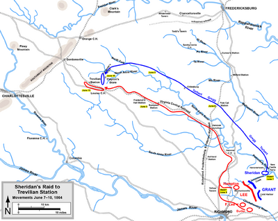 Армия северян, разрушавшая всё на своём пути, стала продвигаться на юго-запад, вверх по течению Шенандоа и после проигранной битвы при Нью-Маркете 15 мая, ставшей причиной отставки Сигела и назначения Хантера, одержала победу при Пьедмонте 5 июня, о чём немедленно было послано сообщение в Потомакскую армию. Ещё не зная об этом успехе, Грант решил ещё раз бросить в тыл врага свою кавалерию во главе с Филипом Шериданом. Первым был поход 9-24 мая, когда янки в Сражении при Йеллоу-Таверн сразили легендарного Джеймса «Джеба» Стюарта и подошли к самому Ричмонду. Теперь Грант решил направить его на запад. Изначально «маленькому Филу» (он и вправду был невелик ростом) было приказано отвлечь на себя кавалерию Юга и уничтожить мост через реку Риванна на Центральной Виргинской железной дороге, к востоку от Шарлотсвилла, и железнодорожное полотно оттуда до города Гордонсвилла. После этого они должны были немного вернуться и разрушить железную дорогу до самой узловой станции Ганновер (близ Ричмонда). Но сразу после своего приказа Шеридану Грант узнал о победе Хантера и взятии им Стантона. Тогда он внёс изменения в свой план. Вместо разворота к Ричмонду кавалеристам следовало, выведя из строя железную дорогу, дожидаться Хантера в Шарлотсвилле. Объединившись с ним, северянам надо было оставить одну бригаду, чтобы перекрыть канал реки Джеймс. 1-я кавалерийская дивизия бригадного генерала Альфреда Торберта (одной из бригад командовал также бригадный генерал Джордж Кастер) и 2-я кавалерийская дивизия бригадного генерала Дэвида Грегга поступили под его командование. Таким образом, у Шеридана были две из трёх кавалерийских дивизий, которыми вообще располагала Потомакская армия. Также к его отряду была присоединена конная артиллерийская бригада капитана Джеймса Робинсона, располагавшая четырьмя (по другим данным шестью) батареями. Роберт Ли также понимал, каким опасным, даже безнадёжным станет положение, если юнионисты переправятся через Джемс, последнюю естественную преграду перед Питерсбергом. Его армия была сильно обескровлена и не смогла бы выстоять против Гранта в открытом бою. Ближе к середине июня он писал генерал-лейтенанту Джубалу Эрли: