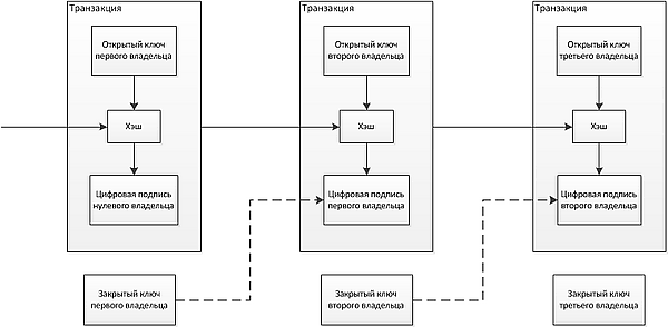 Биткойны могут быть переданы любому, кто сообщит корректный биткойн-адрес или открытый ключ. Для передачи биткойнов текущий владелец создаёт новую транзакцию, которая, помимо указаний о количестве передаваемых биткойнов, содержит подписанный инициатором хеш предыдущей транзакции, по которой биткойны были получены. Предыдущая транзакция становится «входом» текущей транзакции. Также указывается публичный ключ или биткойн-адрес нового получателя («выход») (см. схематическую структуру на рисунке). Транзакция широковещательным запросом по открытым каналам без шифрования отправляется в сеть. Остальные узлы сети, прежде чем принять транзакцию к обработке, проверяют подписи. Правильность подписи свидетельствует, что инициатор действительно является владельцем секретного ключа для адреса «выхода».