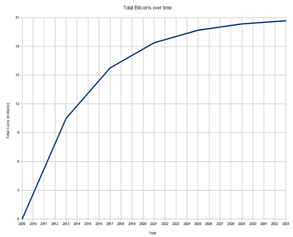 После формирования каждых 210 000 блоков (приблизительно раз в 4 года) запрограммировано размер вознаграждения новыми биткойнами уменьшать вдвое[90], то есть это значение является убывающей геометрической прогрессией (размер вознаграждения 50 → 25 → 12,5 → …)[90]. Общий объём эмиссии биткойнов ограничен, так как является суммой членов убывающей геометрической прогрессии, и не превысит 21 миллион. На май 2014 года в обращении находилось 12,7 миллиона биткойнов[48].