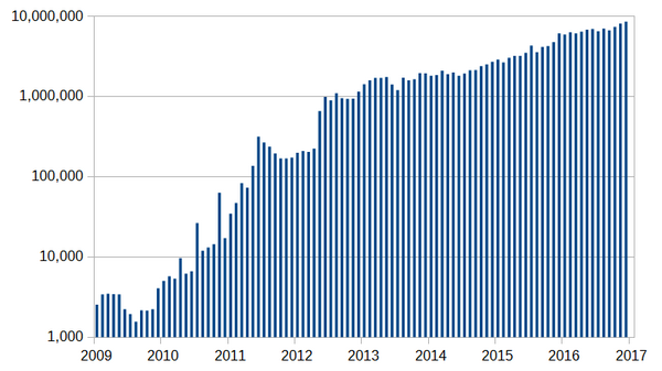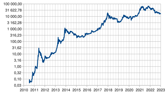 В 2017 году цена биткойна очень выросла. В начале года она была чуть ниже 1000 долларов, 28 ноября достигла 10 000 долларов[221]. 17 декабря 2017 года цена достигла исторического максимума в 19 666 долларов, после чего началось затяжное снижение.