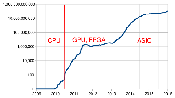 В первых версиях программы-клиента была кнопка «сгенерировать новые биткойны»[48]. Для поиска хеша заголовка нового блока использовался центральный процессор компьютера. Вероятность успешного создания блока майнером приблизительно равна отношению его вычислительной мощности к вычислительной мощности всей сети, и если это отношение очень мало, то вероятность получения награды даже за длительный промежуток времени будет незначительной. Желающие увеличить вероятность получения вознаграждения стремятся задействовать как можно большие вычислительные мощности. Особенность задачи перебора хешей позволяла применить максимальное распараллеливание вычислений. Для этого хорошо подошли многопоточные графические процессоры (GPU) после появления небольшой дополнительной программы[78] (в сотни раз производительнее CPU[79]) и платы с FPGA (производительность аналогична видеокартам, но превосходят их по энергоэффективности). После этого майнинг при помощи центрального процессора оказался нецелесообразным из-за слишком малой вероятности получить вознаграждение, и кнопку в программе-клиенте убрали. Позднее были выпущены специализированные процессоры (ASIC), ориентированные на вычисление хешей для сети «Биткойн», ещё более производительные, чем GPU и FPGA. С 2013 года майнинг без специализированных процессоров (на видеокартах или центральном процессоре) стал нерентабельным: стоимость потребляемой электроэнергии превысила средний результат[80][81].